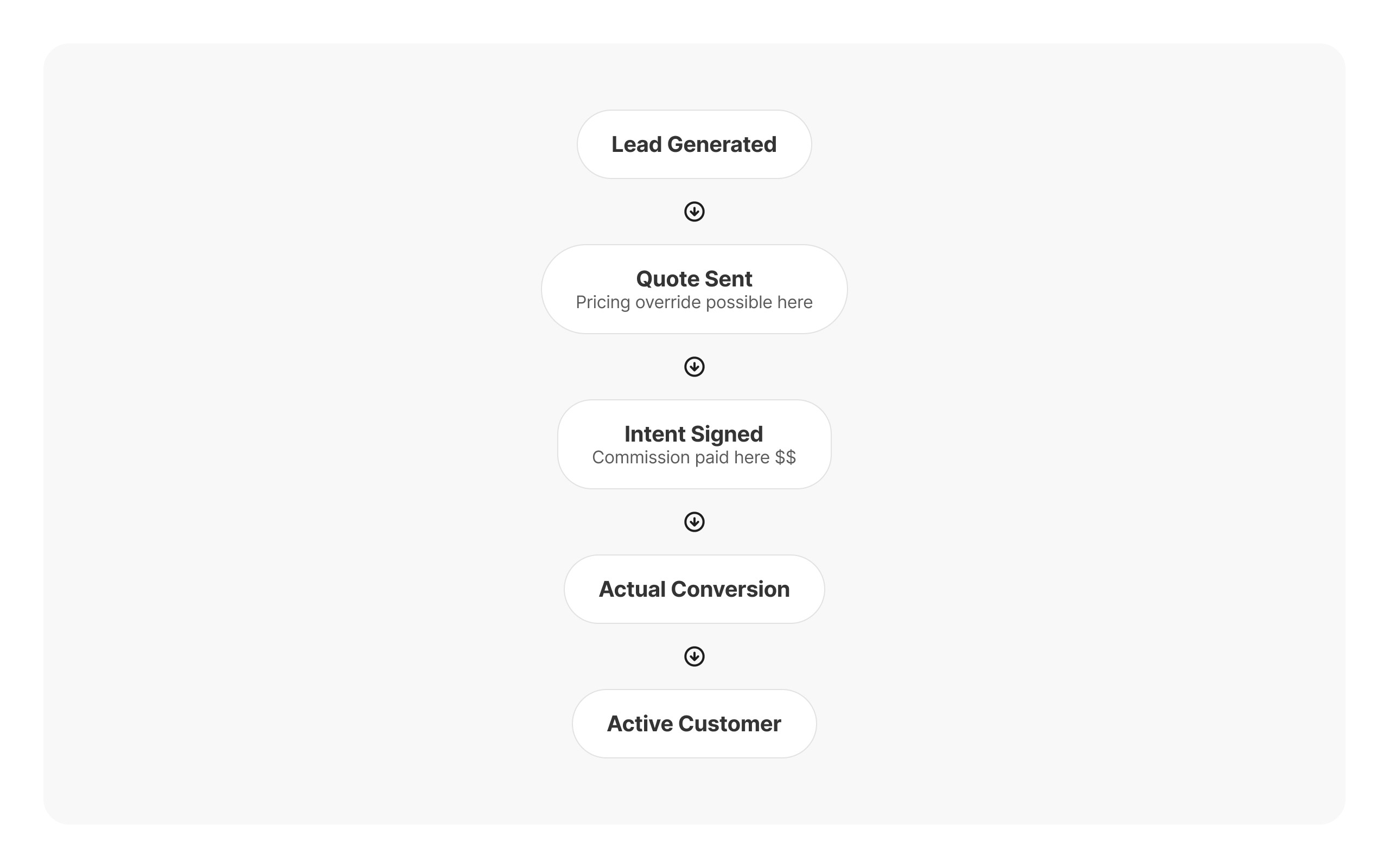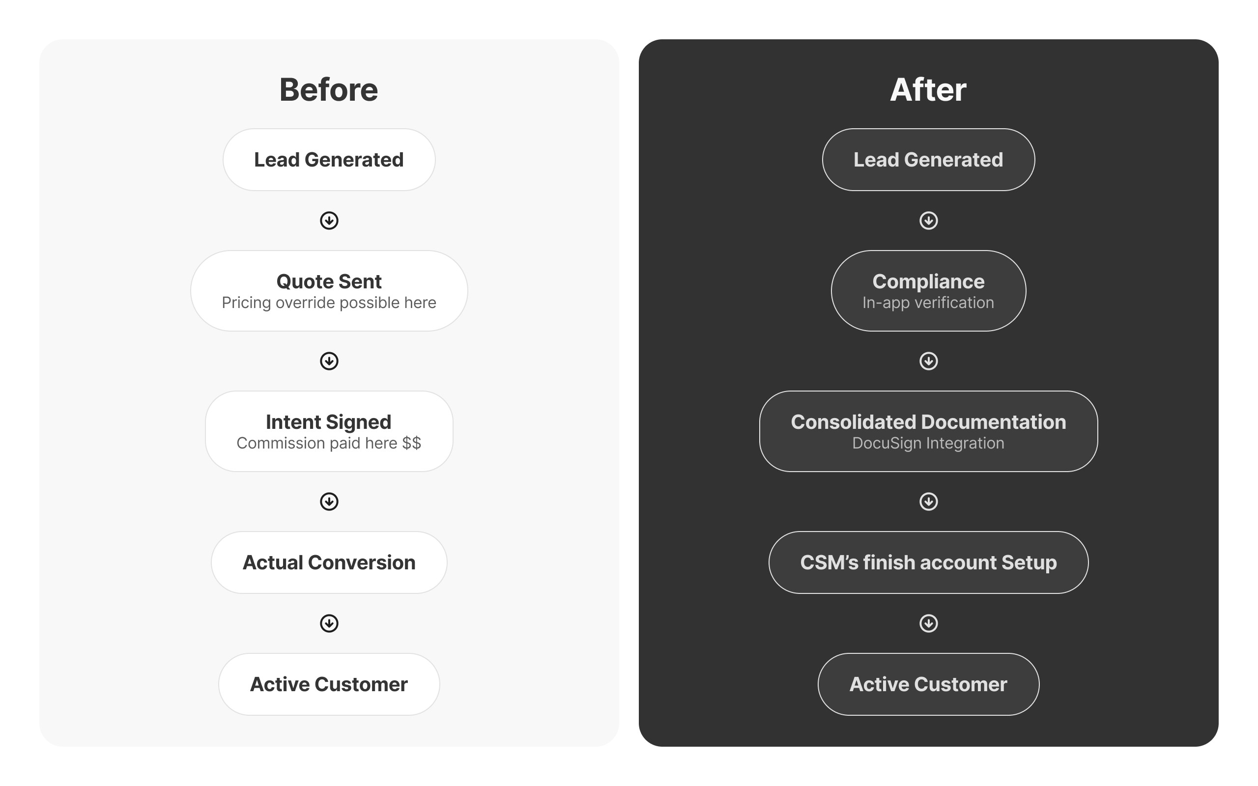Customer retention wasn't the issue, 94% of customers stayed. Getting them in the door was the problem. Every step from first contact to active account ran through email: informal data requests, manually prepared quotes with no guardrails, commissions paid before anyone verified a lead was real. The process averaged several weeks, and no one in Sales, Compliance, or Customer Success could see where any given customer stood.