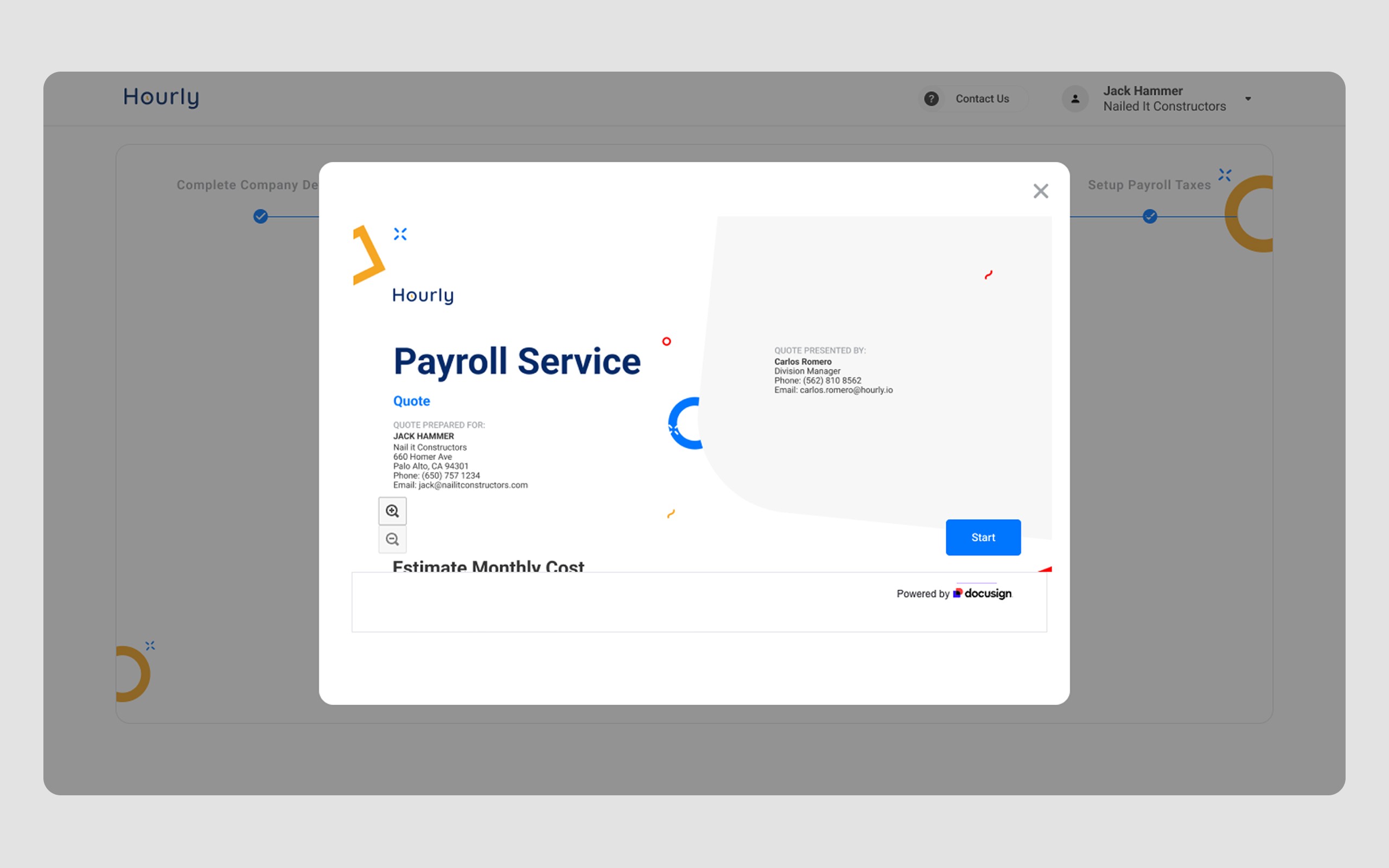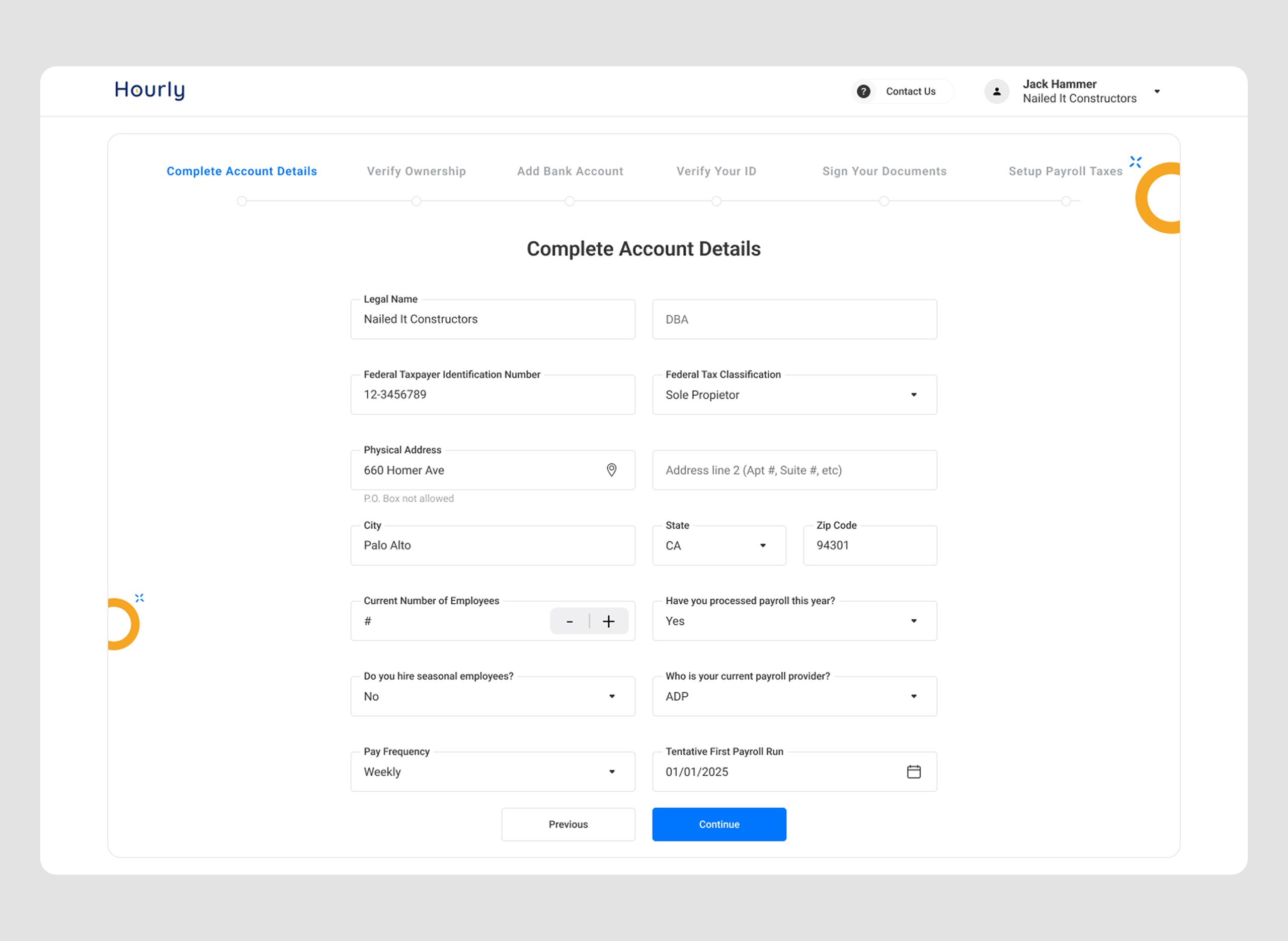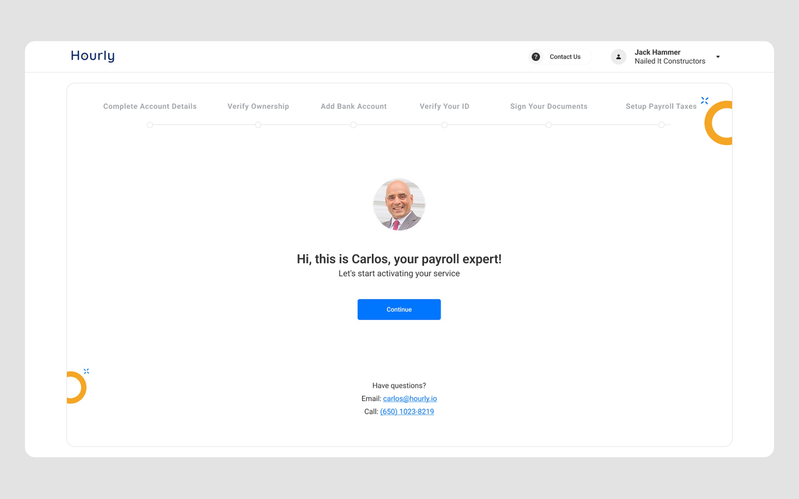 CSMs initiate the invite through the platform, not Sales, which matters for role clarity from the start. The customer gets a branded email and enters a guided stepper built around what compliance and banking actually require: account details, ownership verification, bank connection via Plaid, ID verification via Persona, document signing via DocuSign, payroll tax setup via CheckHQ. Four external services, one coherent experience. I worked closely with engineering to define integration points and design the transition states so the customer never felt like they'd left Hourly, even when third-party flows appeared mid-stepper.