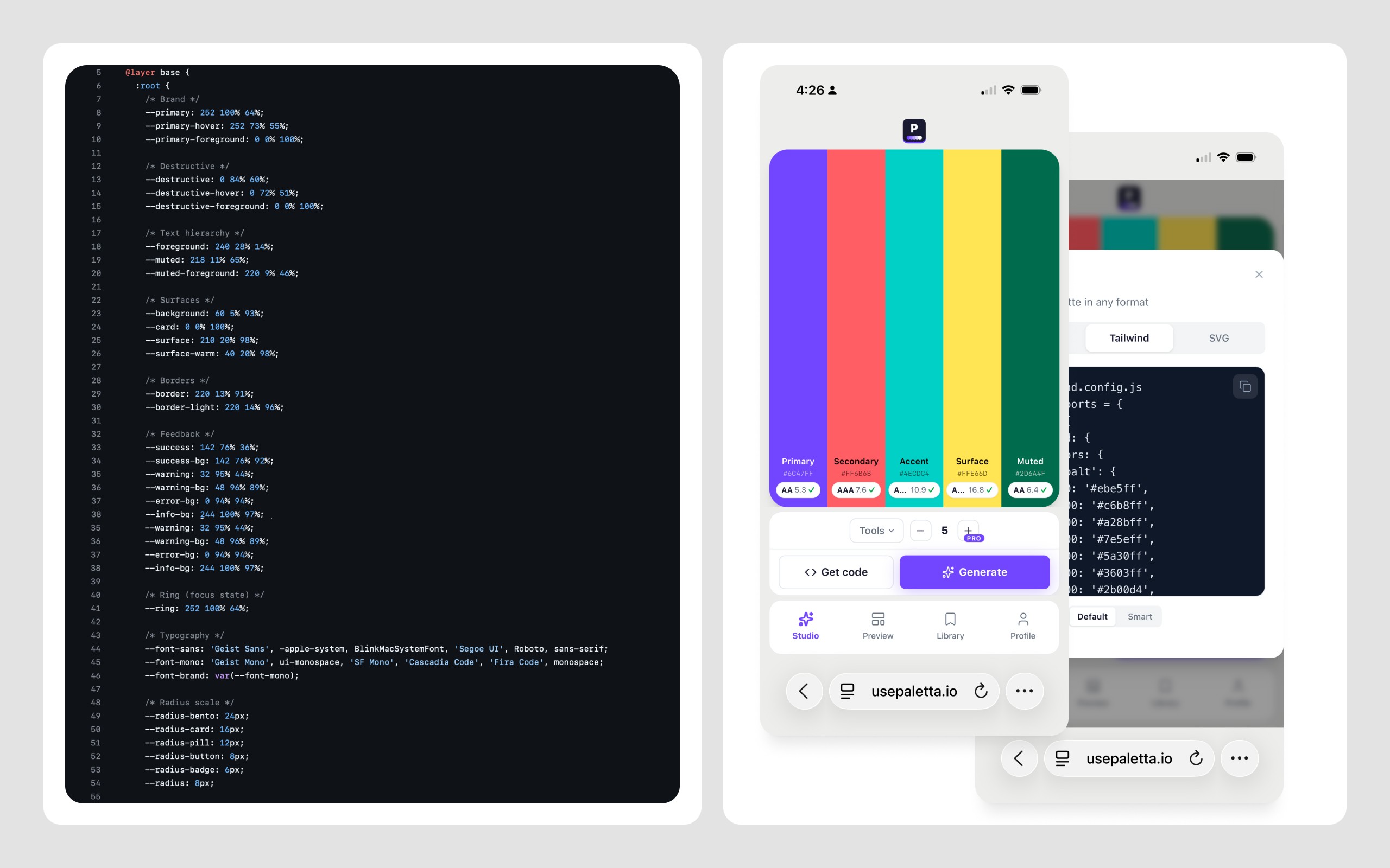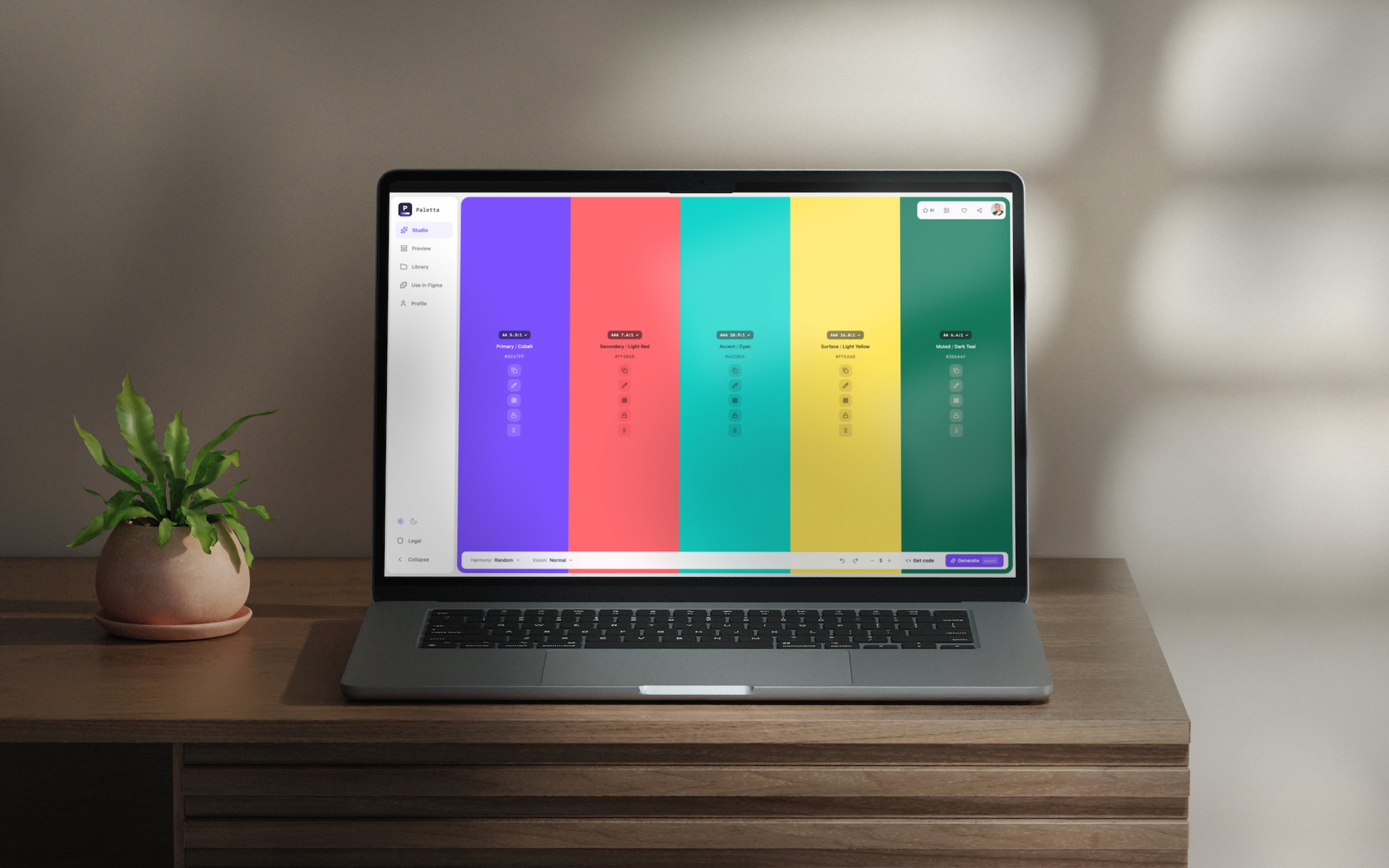 Paletta is a color system tool built for designers and frontend engineers who need to move from inspiration to production without losing anything in the handoff. It handles palette generation, full shade scales, WCAG validation, vision simulation, and Tailwind CSS export. The Figma plugin brings it directly into the design workflow.