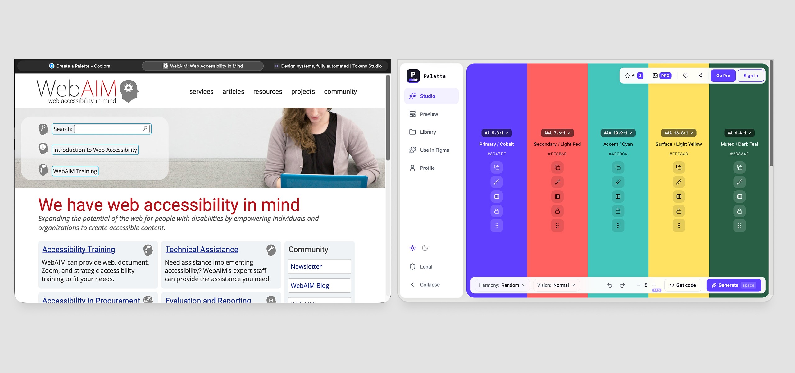 Color systems look simple from the outside. In practice they involve generating perceptually balanced shade scales, validating contrast ratios across every combination, simulating how the palette reads under different color vision deficiencies, and exporting tokens in formats engineers can actually use. Most teams solve this by stitching together three or four separate tools and a lot of manual work in between.