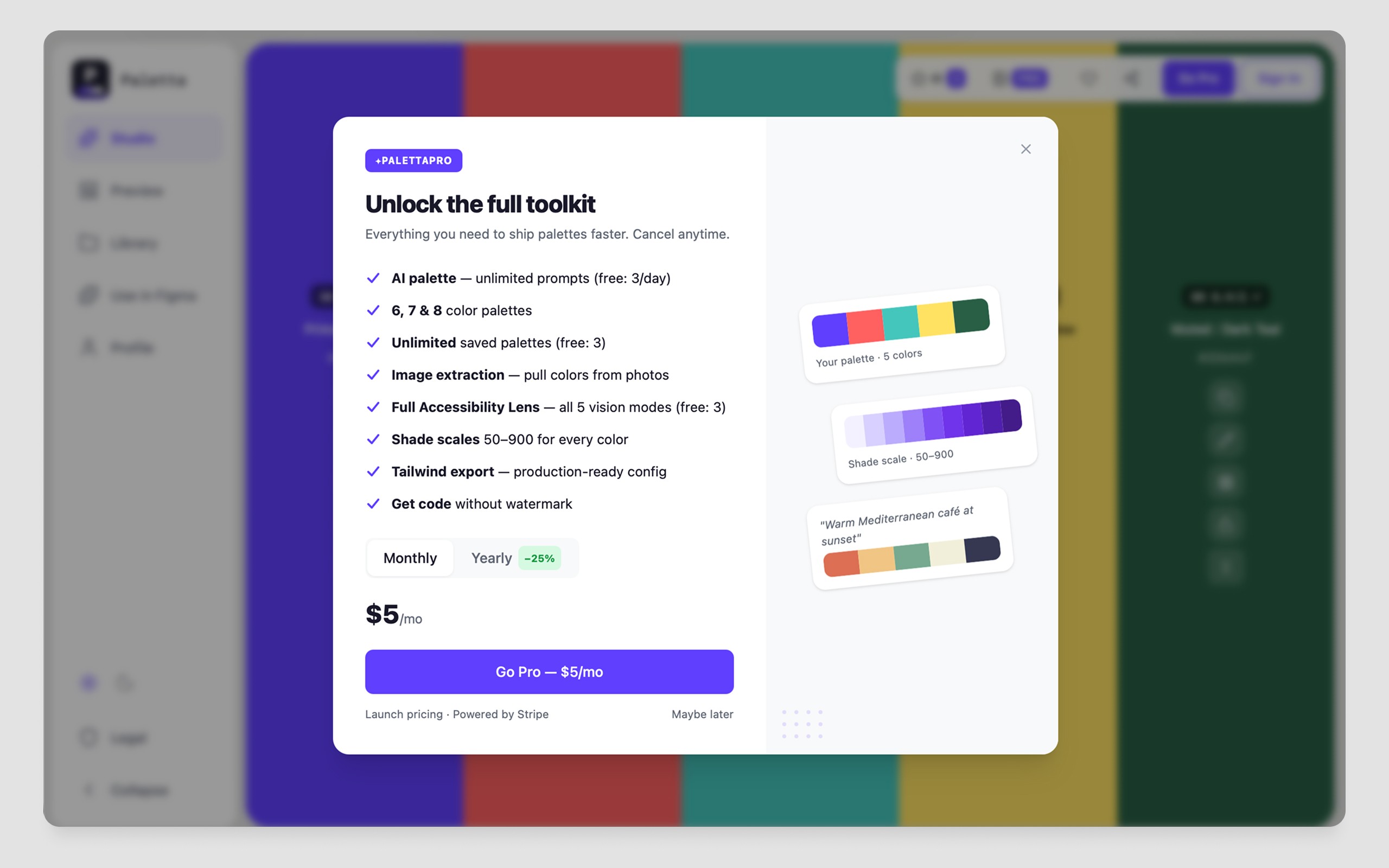 Paletta is live at usepaletta.io with a free tier and Pro plan at $5 per month or $45 per year. Stripe payments are active, PostHog analytics are running, and the Figma plugin is submitted and in review.