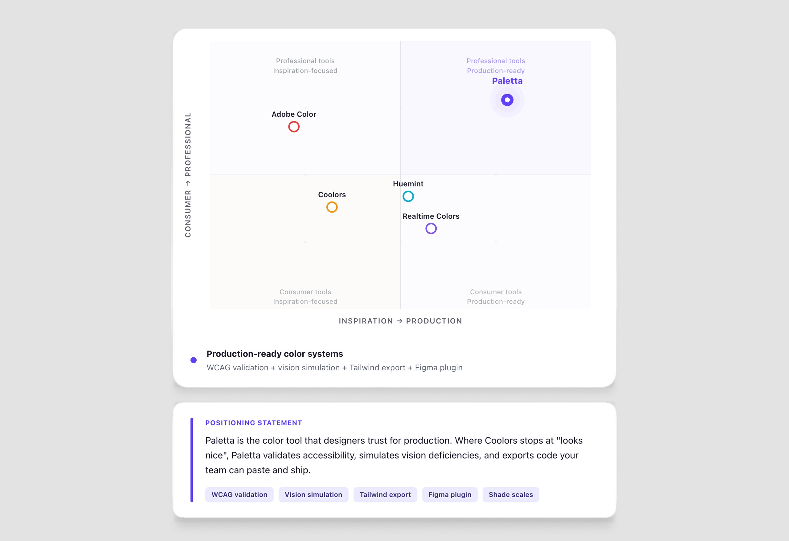 The gap was clear. Nobody owned the professional designer-to-frontend pipeline. The segment that needs palettes that ship, not palettes that look good on a mood board. That's where Paletta sits.