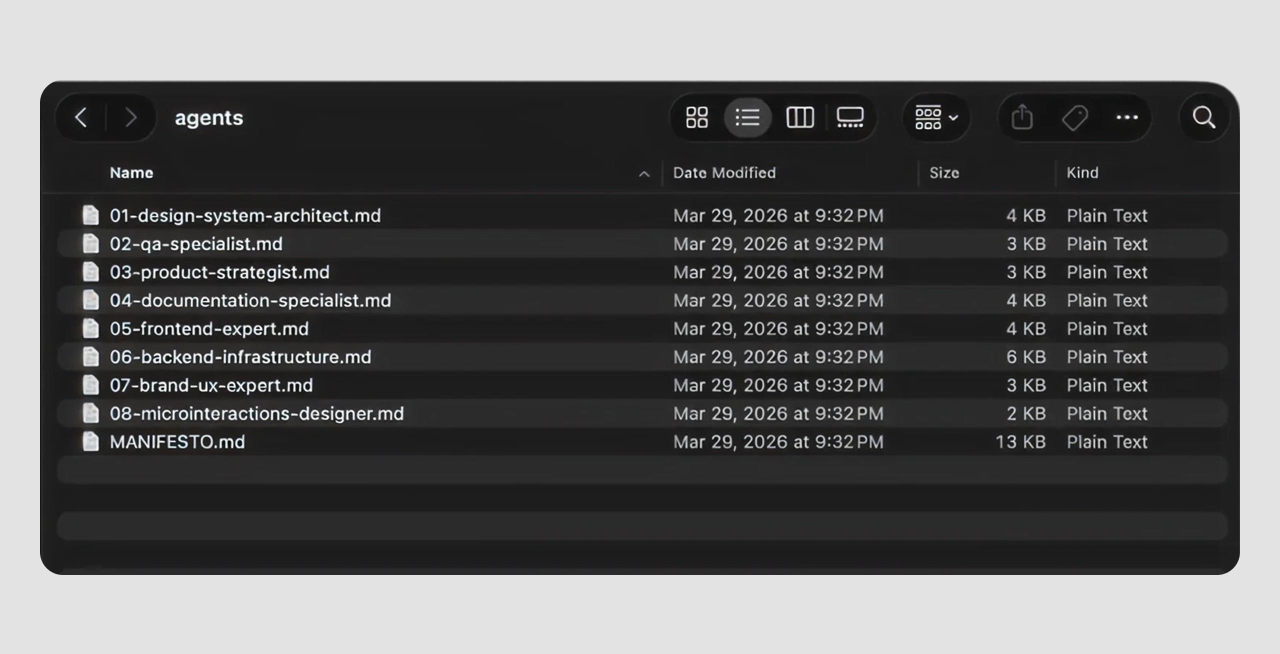 The 8 agents: Design System for token compliance, QA Specialist for regression and accessibility, Product Strategy for prioritization, Documentation for roadmap and build logs, Frontend Expert for architecture, Backend Infrastructure for Supabase and Stripe, Brand and UX for copy and voice, Micro-interactions for motion patterns.